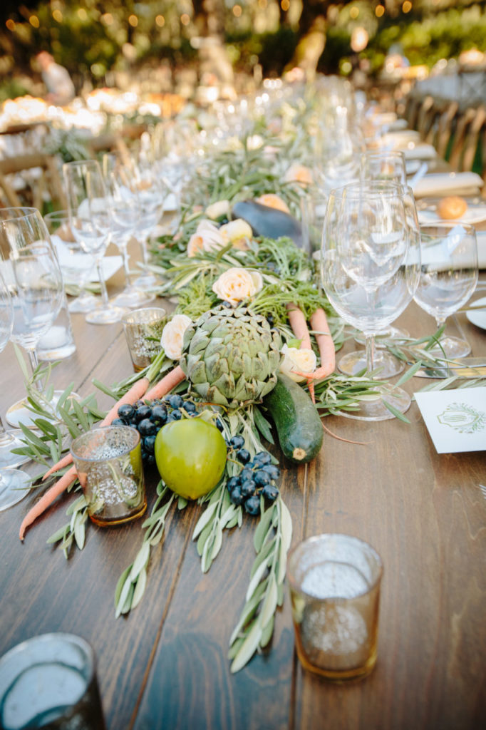 Foraging Fashion: This garland of olive leaves and peach roses was embellished with freshly grown fruits and vegetables from Beltane Ranch. Bride Ali Canty asked of designer/planner Alicia K Designs that “anything (they) can gather from the gardens” be included in the design. (Photo courtesy of Michelle Walker Photography)