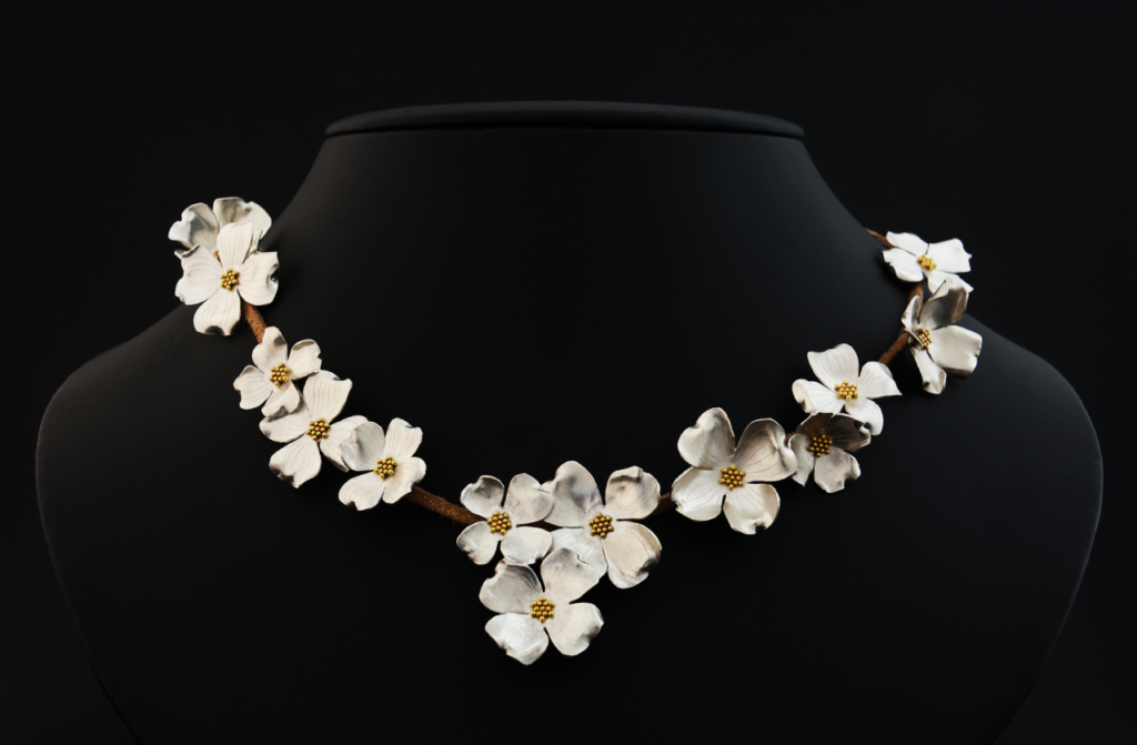 Forever Flowers: Flowers that keep in the form of jewelry as fanciful as a flower. Dogwood flowers shaped from sheets of sterling silver are strung onto leather to create a delicate piece of enduring beauty. This necklace by Santa Rosa jewelry artist Michelle Hoting can also be worn as a tiara. $500 (as pictured), $40 (each flower), Michelle Hoting Jewelry Artist, 707-791-4680, michellehoting.com