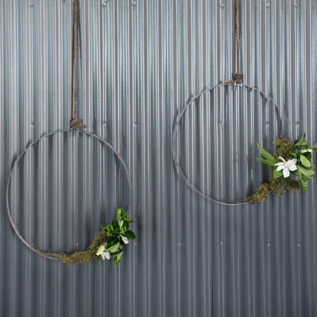Next Level Decor: Elevate your design with a modern spin. Hang floral hoops on a wall or from a tree or other structure to create a whimsically pretty wedding backdrop. Flowers were farmed and arranged by Smita Topolski of Page Street Studio in Sebastopol. info@pagestreetstudio.com, pagestreetstudio.com. (Photo courtesy of Tia & Claire Studio)