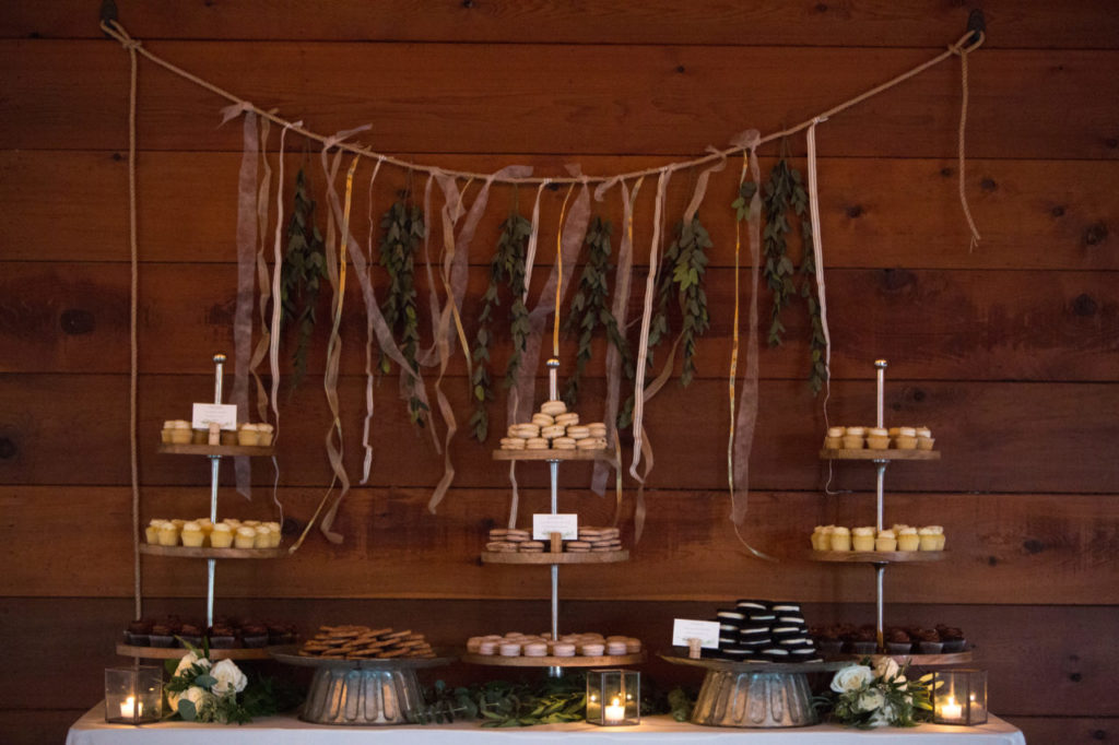 Cake out, Florals up: Two traditions are turned on their heads here. Traditional cake is swapped for mini desserts. And flowers which usually grace the dessert table hang beautifully on the wall behind it. Wall hanging is by Flourish. (Photo courtesy of Suzanne Karp Photography)