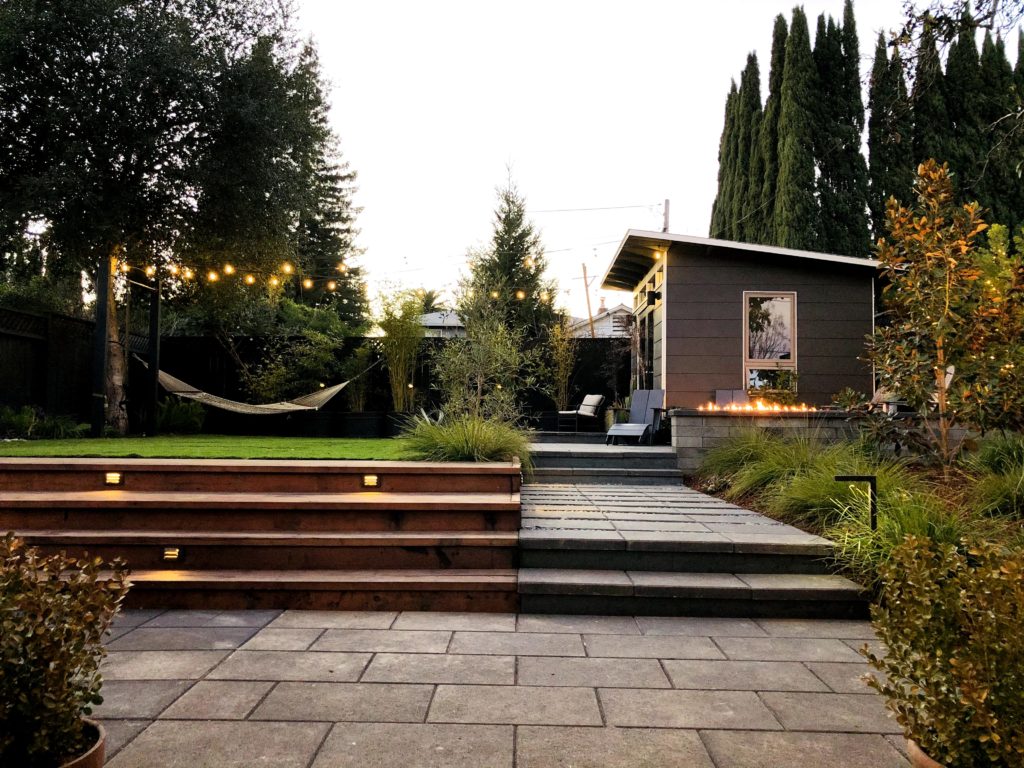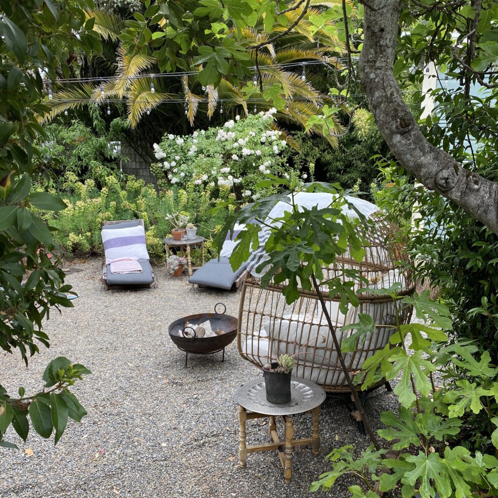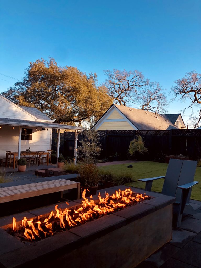 Create zones for different uses: There’s so much to love about this “Quarantine Renovation,” which Caroline Bontia details on her blog, Shop Local Healdsburg. Bontia and her husband Kevin Coady, coach of TriForce Triathlon Team in Healdsburg, envisioned a pretty space with zones for multiple uses. The couple hired Mark Perine of Nature’s Tailor Landscaping to help them transform their outdoor space. The issue of the sloping backyard was solved by creating two separate levels connected by steps that double as seating—an amphitheater for watching improvised jam sessions with friends, the couple jokes. A modern structure by Studio Shed, based in Boulder, serves as a work-from-home space for Bontia, while the artificial turf is as a workout spot for Coady and his clients. Other areas—by the dining table and fire pit—are great for gatherings. (Shop Local Healdsburg)