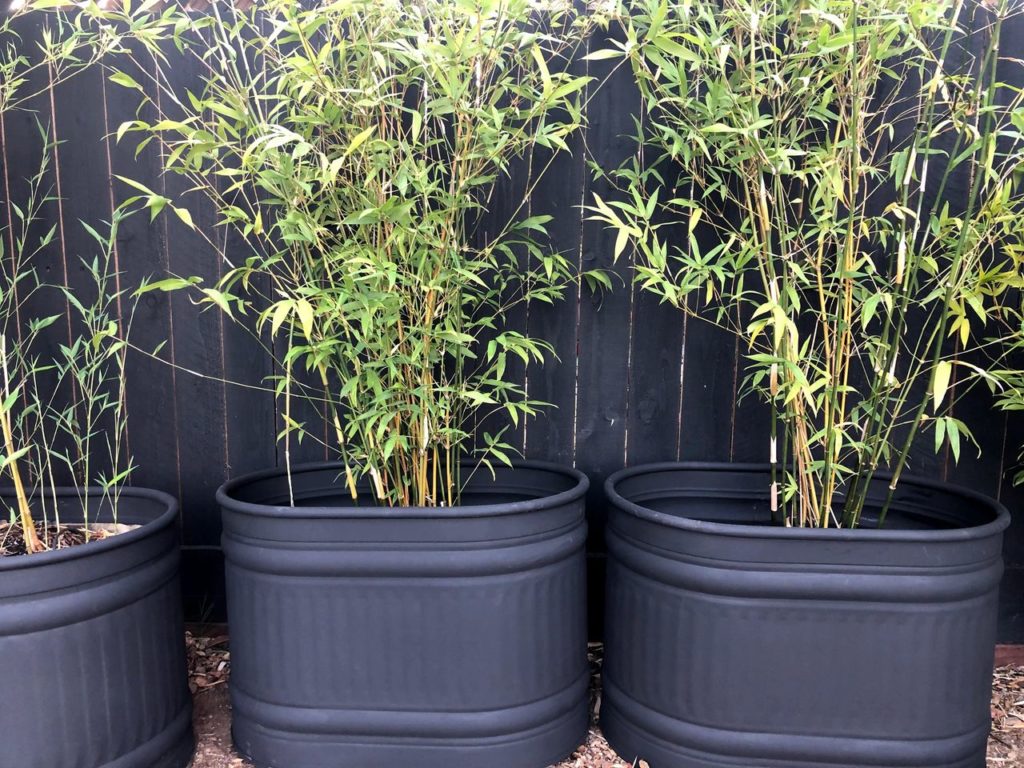 Create clean cohesion with black paint: Caroline Bontia and Kevin Coady painted the fence and stock containers in their Healdsburg yard black to create a clean, yet dramatic backdrop. The metal containers blend into the fence, which adds emphasis to the green bamboo foliage sourced from Prickett’s Nursery in Healdsburg. (Shop Local Healdsburg)