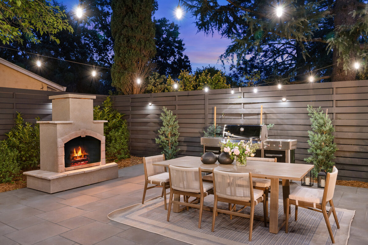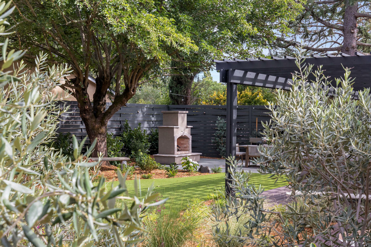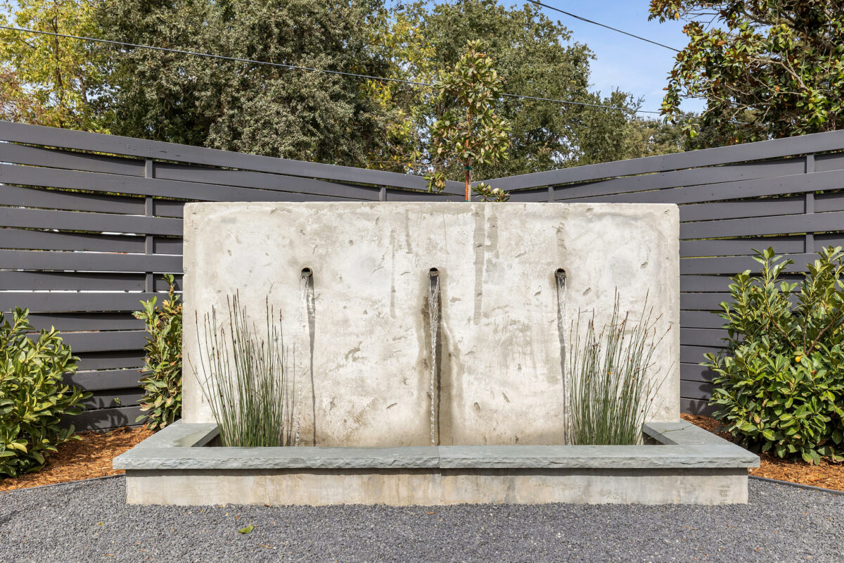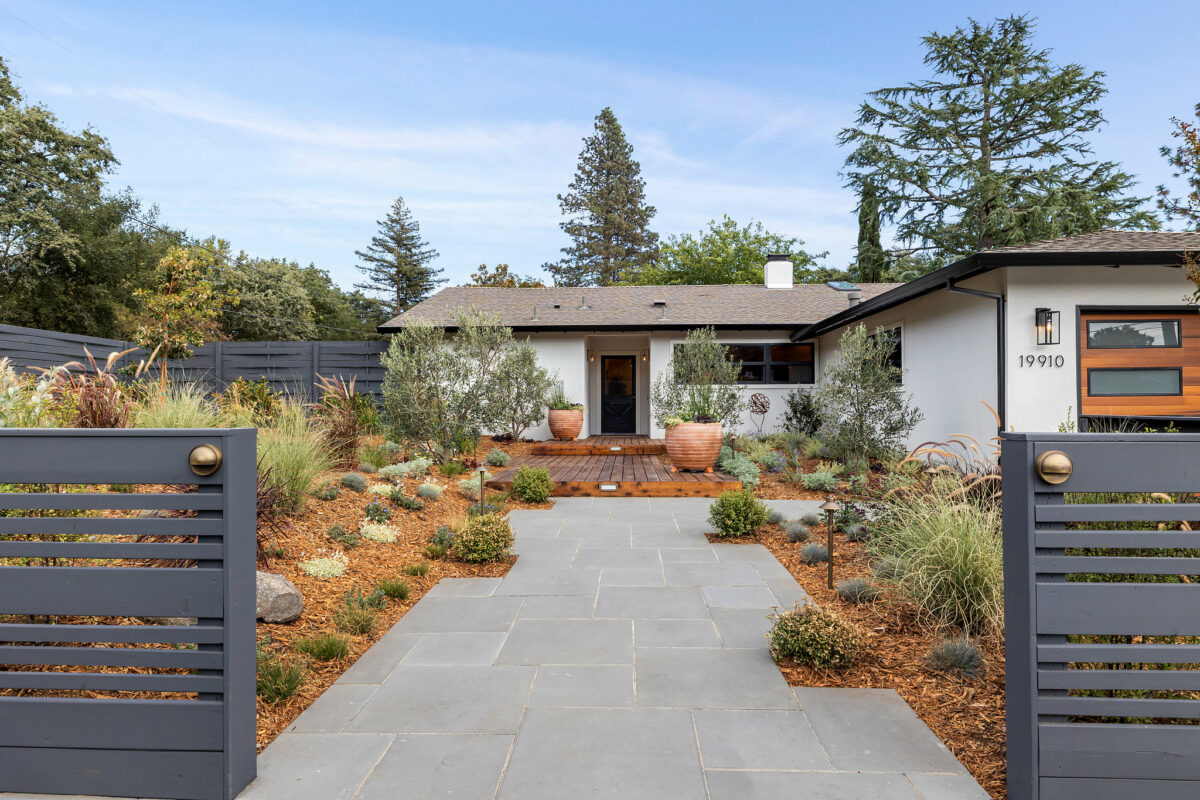 The property comes with plenty of amenities that encourage outdoor living: a fireplace, a kitchen and wet bar, a handmade fountain, and a large trellis. A no-mow lawn, made up of native grasses, is a drainable, breathable low-water alternative to turf. Low-water plants, like olive trees and pollinator-attracting salvia, dot the property.