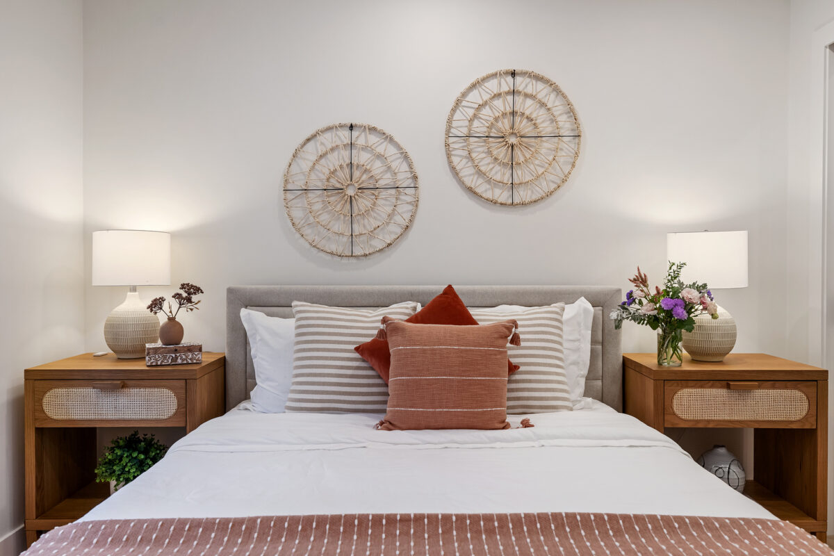 Design details, from artful choices of light fixtures and flooring to handmade cabinetry, give the property a bespoke look. White walls make the dwelling look sleek and expansive.