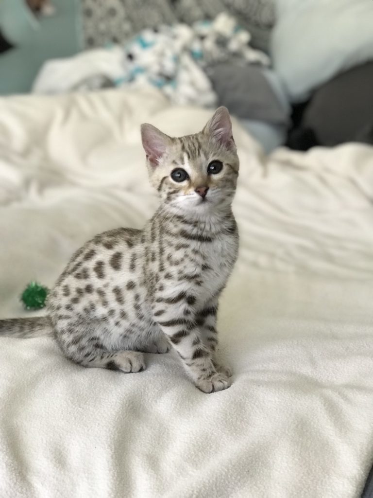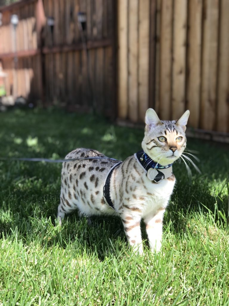 Mowgli: "Mowgli is a 10 1/2 month old Snow Mink Bengal who loves to go for walks in his front yard. He is a determined hunter who will let no insect that enters his home leave alive. He is also very patient and loving to everyone."