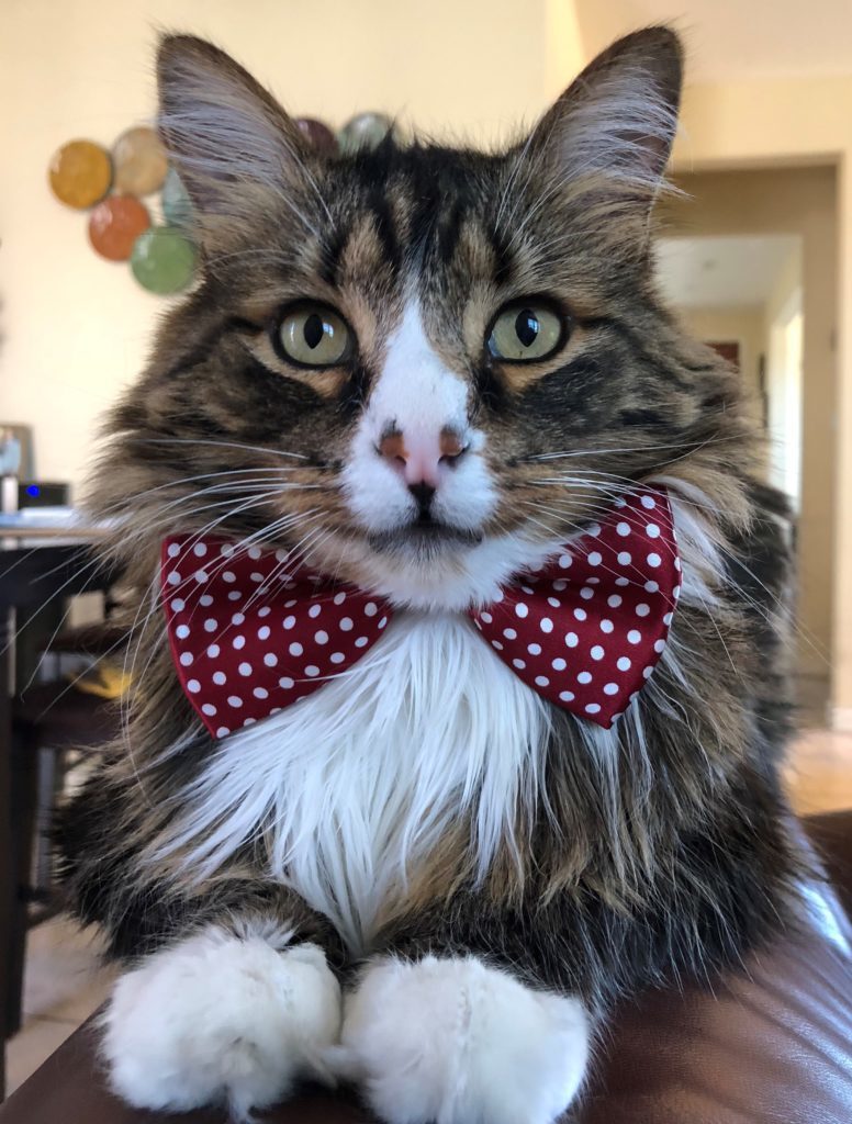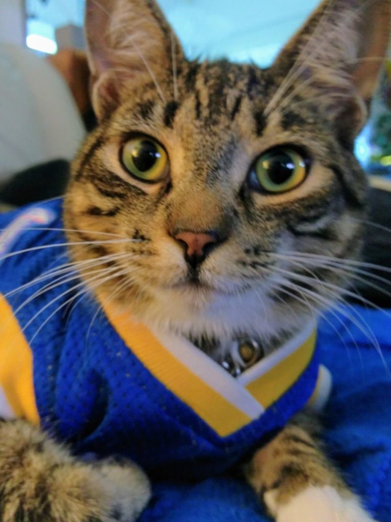 Journey: "Journey is the best cat ever! His favorite teams are the Giants, Warriors, 49'ers and the Sharks, and he likes to sport his team colors while we watch the games together. He enjoys doing tricks such as sit, turn and up or down and roll. Yes, he really is a cat. :)"