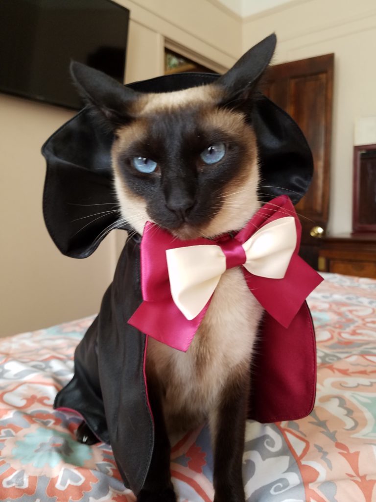 Toby: "Toby is a cute cat but all cats are cute. Why is Toby cute, Toby has the magical blue Siamese eyes that does a lot of talking even when he is not talking which is not that often, he is very vocal. Plus he doesn't mind me dressing him up for some pics."