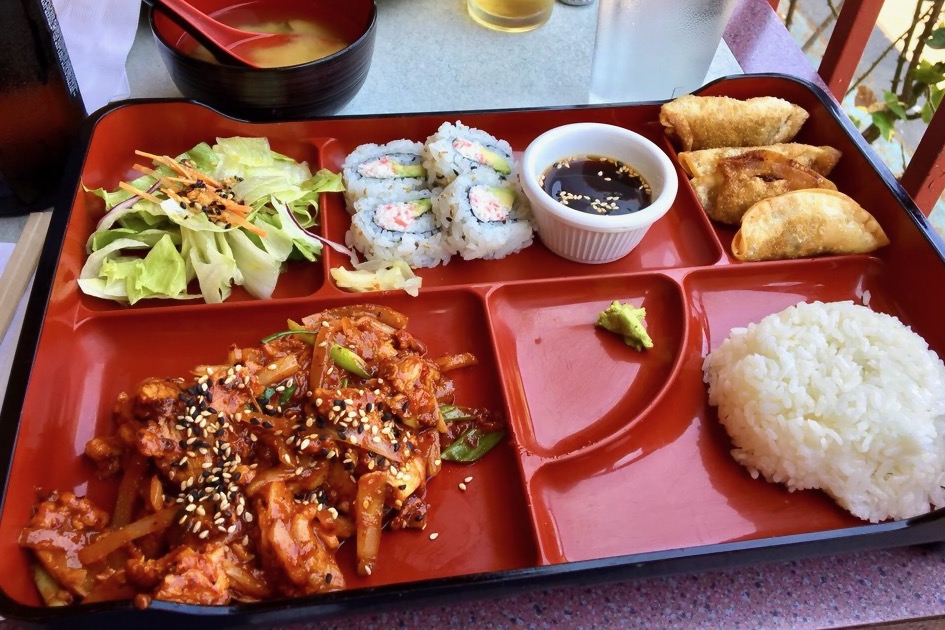 Koala's Fine Food, Guerneville: Lunch bento with California roll, gyoza, soup, salad, rice and a choice of entrees (teriyaki chicken, pork katsu, vegetable tempura) for $13. Burgers are under $10. 16380 Mill St., Suite A, Guerneville, 707-869-3300, koalasfinefood.com. (Jil C./Yelp)