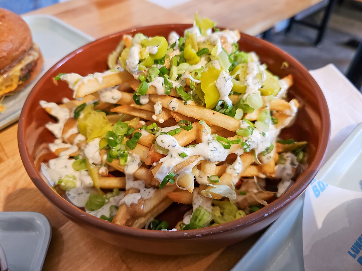 Dirty Fries (minus the bacon), Lunch Box: My mission was to try the Chicken Parmesan sandwich, but I can never resist their crispy fries with Chevre ranch, pepperoncini, confit garlic, and green onions. My friend was vegetarian, so the SoCo Meat Company bacon was on the side. 128 N Main St., Sebastopol, lunchboxsonomacounty.com.