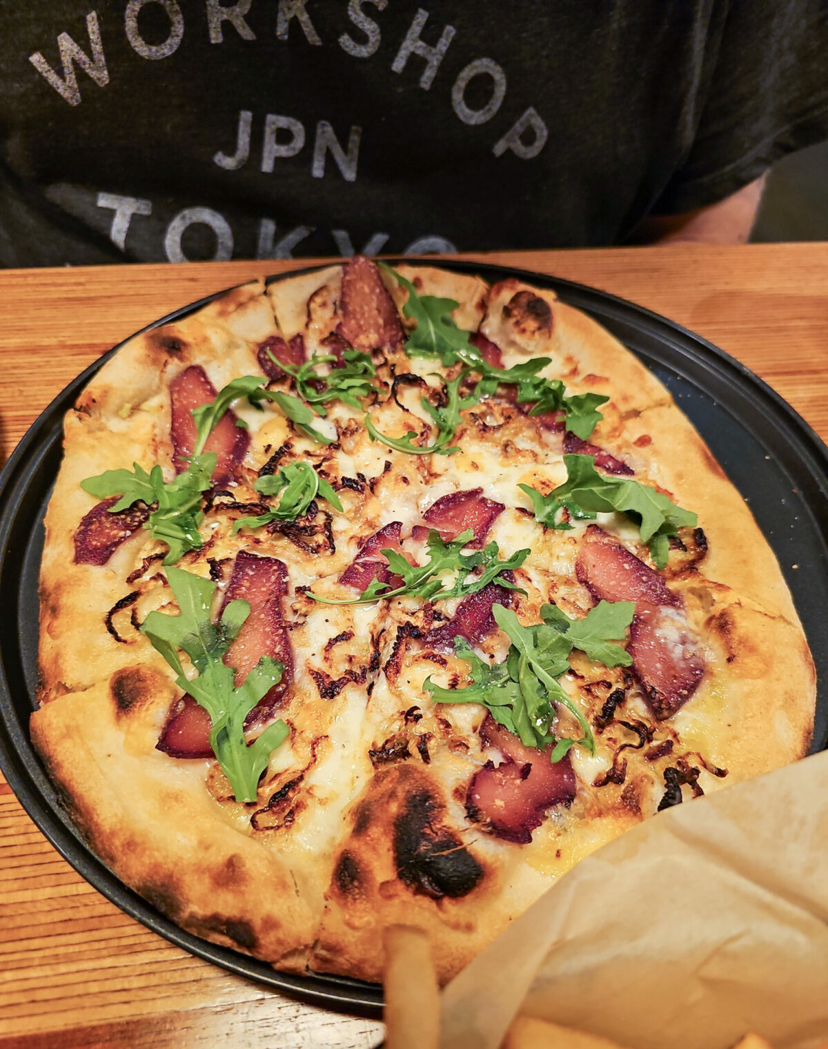 Pinot Pear Pizza, Ausiello's Homeslice: A brand new restaurant in Rincon Valley focused on family-friendly dining and great cocktails. This pizza featured red wine poached pears with fontina cheese and arugula. Tasty woodfired crust. 5755 Mountain Hawk Drive, Santa Rosa, ausielloshomeslice.com.