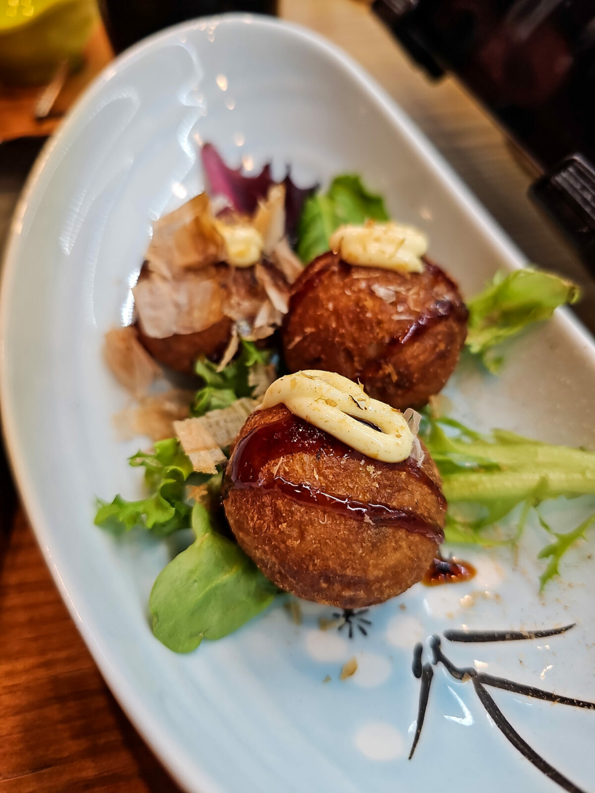 Takoyaki, Kiraku Sushi & Ramen: I have a thing for these battered nuggets filled with bits of octopus. Tobiko flakes and a squirt of mayo dress up these little cuties.