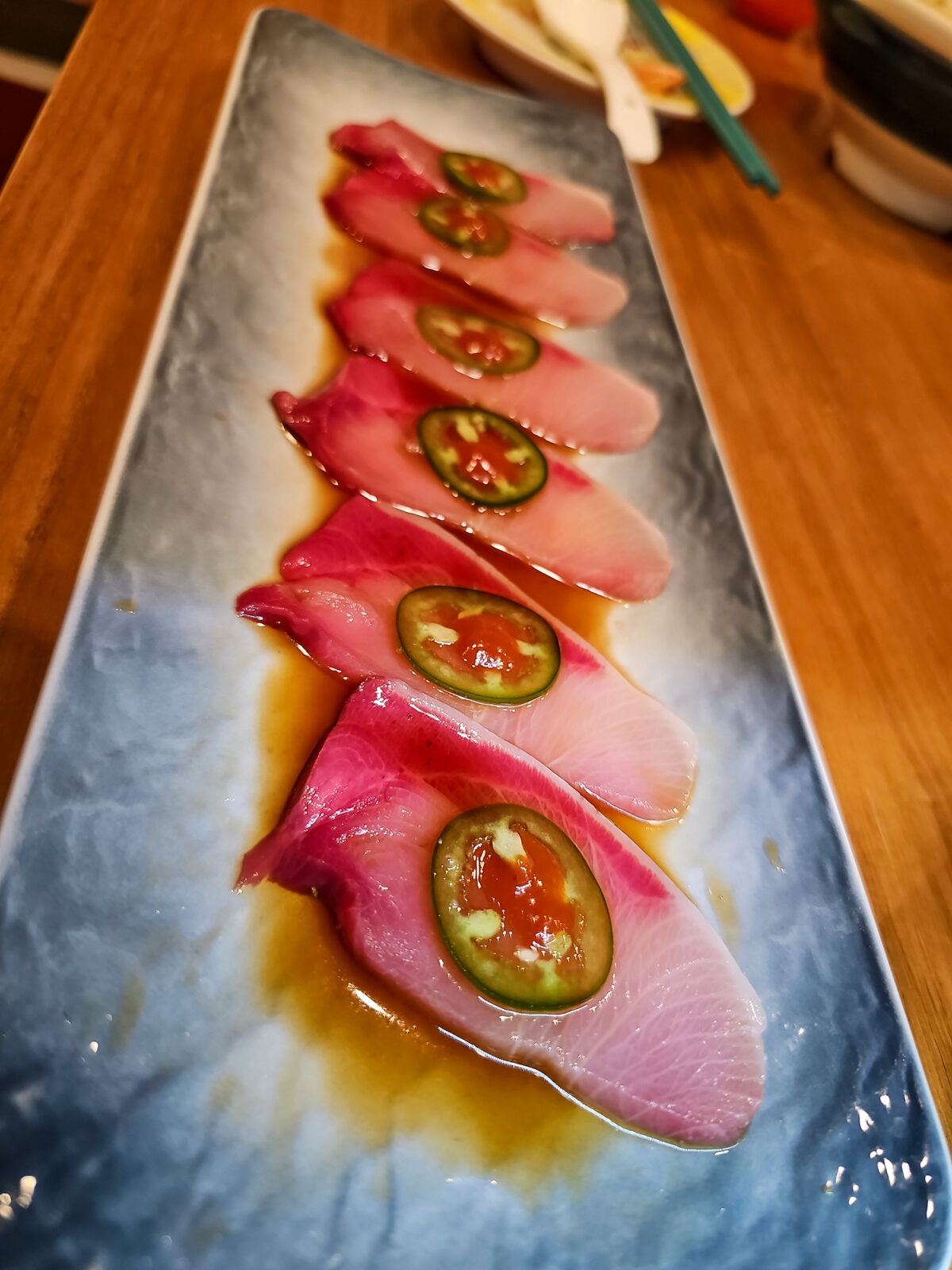 Yellowtail Sashimi, Kiraku Sushi & Ramen: Citrusy ponzu sauce, thinly sliced yellowtail, a hint of heat from jalapeno slices. A favorite dish.
