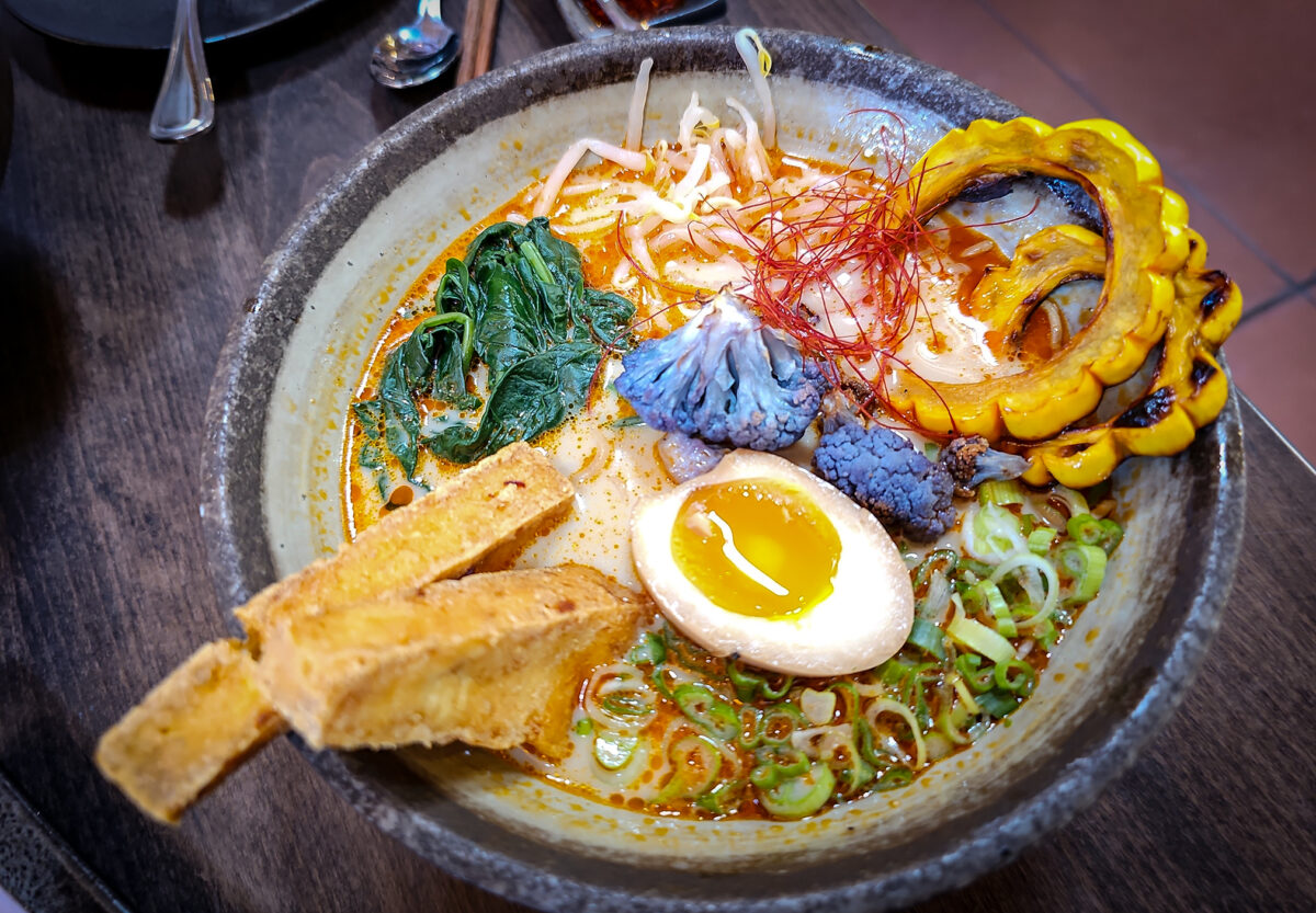 Vegan Tonkatsu Ramen, Ramen Gaijin: The ramen's creaminess comes from oat milk. I loved the mix of fried tofu, purple cauliflower and roasted squash. The egg isn't included in the vegan ramen, but can be ordered as an add-on.
