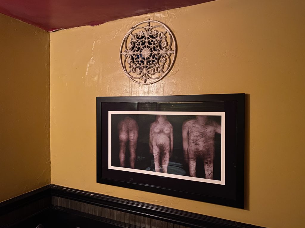 Slightly disturbing art at Underwood Bar and Bistro ensures no one stays too long in the restroom. (Kasey Williams)