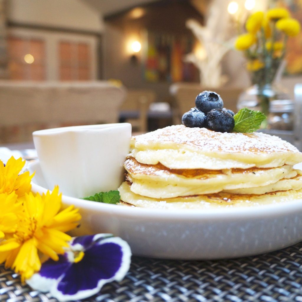 Lemon Bellwether Farms Ricotta Pancakes. Served with a blueberry compote and pure maple syrup from @vintnersinn.