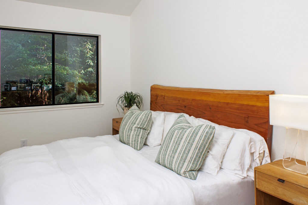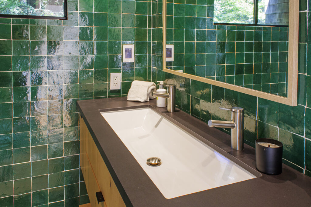 In the main bedroom, the focal point is a redwood slab headboard. Volpatt fashioned this “redwood chic” piece of decor from wood from Sturgeon’s in Sebastopol, a steam-powered lumber mill that has been around since the early 1900s and now serves as a museum. The main bathroom features vibrant green Moroccan tiles that pick up the color of the redwood canopy outside.