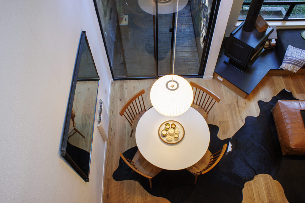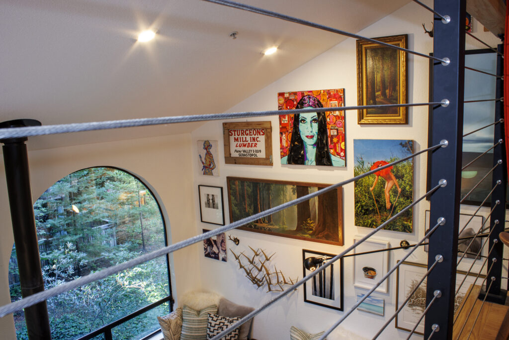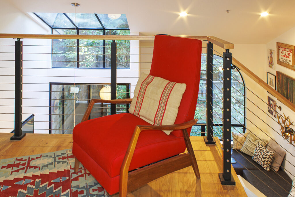 Volpatt worked with interior designer Christian Damerow to bring more light into the home and create space for hosting overnight guests. The pony walls that framed the staircase were replaced with wood-framed cable railings, connecting the first and second floors in a way that allows more light to flow through the space. The look was capped off with nature-centric touches, including plenty of stained woods and a layout that yields focus to the towering redwoods outside.