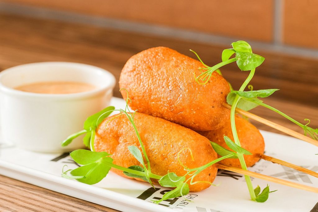 The lobster corn dogs are a menu favorite at Sky & Vine. Order them during the Reverse Happy Hour (9 p.m. to closing time, Sun—Thurs), and you won’t feel guilty about not sharing. (Courtesy photo)