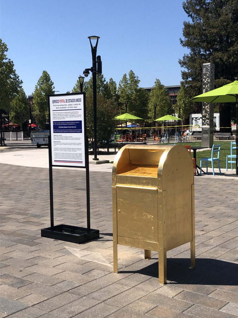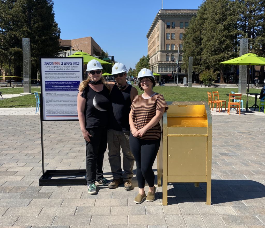 Local artist Jessica Rasmussen came up with the idea for the “Portal Service.” Using a grant from the Open & Out program in downtown Santa Rosa, she called on friends and fellow artists Julian Billotte and Anna Wiziarde to help coat a USPS mailbox in solid (imitation) gold.