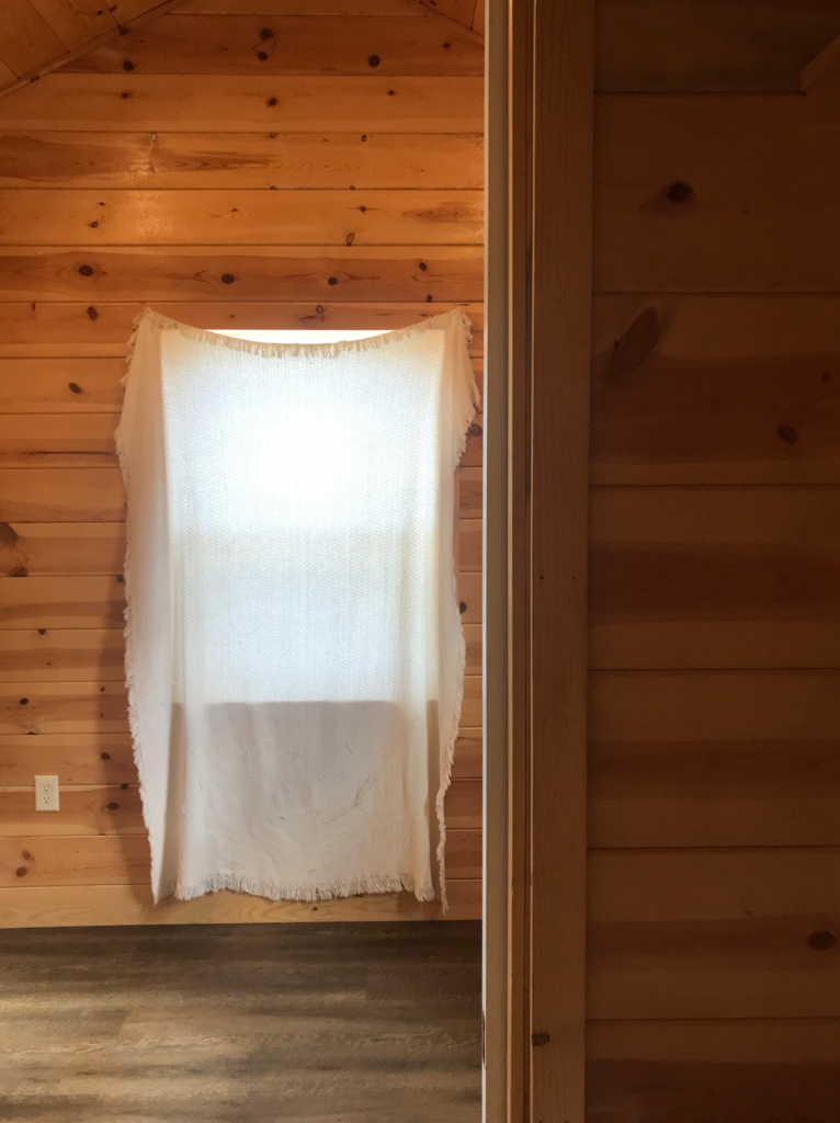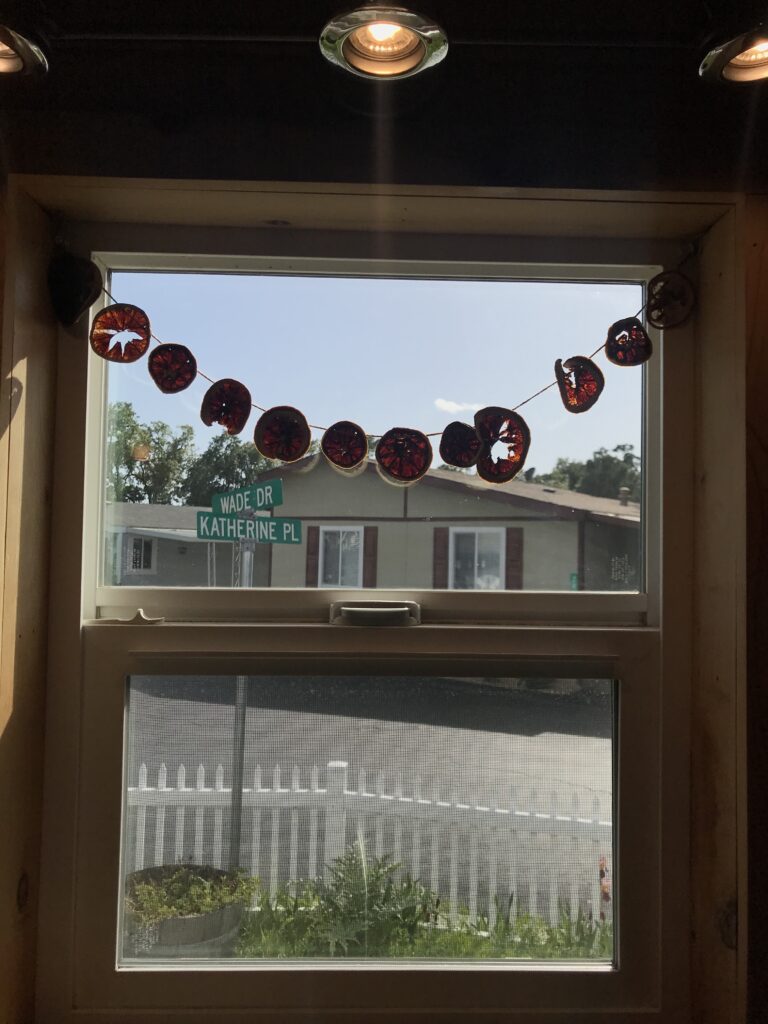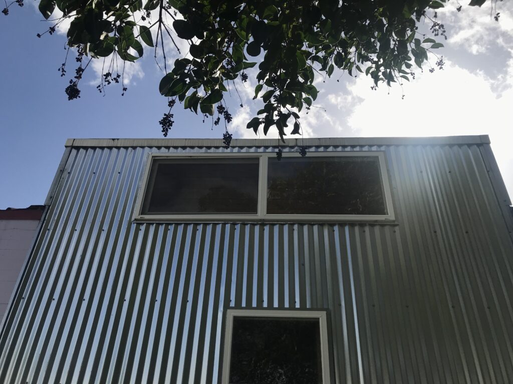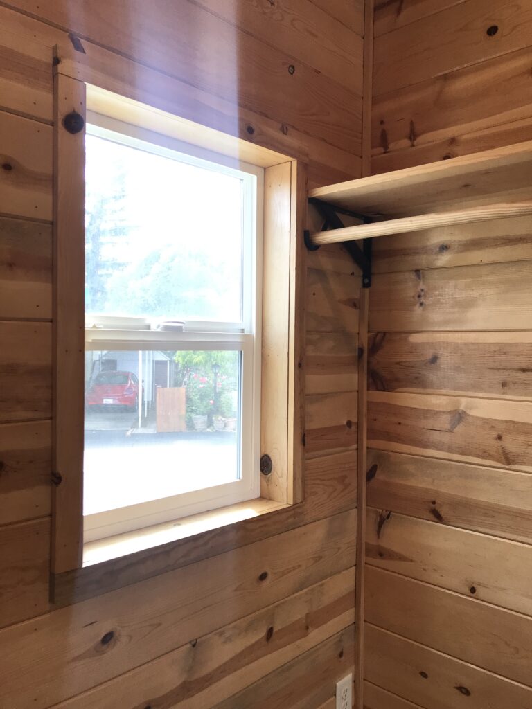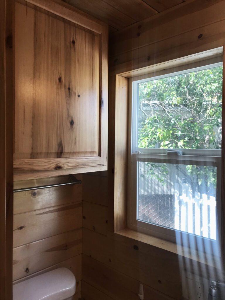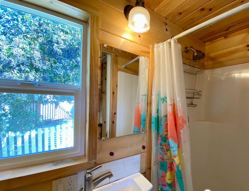 An A-frame roof and multiple windows let in lots of light in. In fact, light is this home’s secret weapon against its small size. All four sides of the home have windows; there’s even a window in the front door. Views of trees at the all-age mobile park, where the home is currently parked, enhance the feeling of openness.