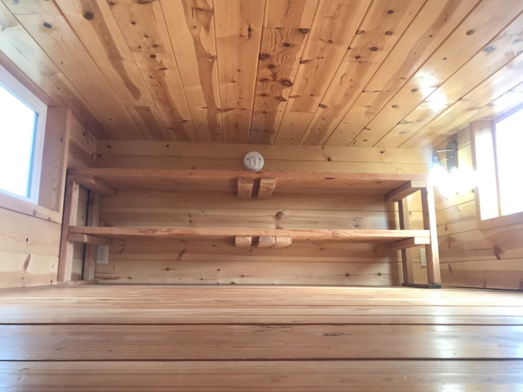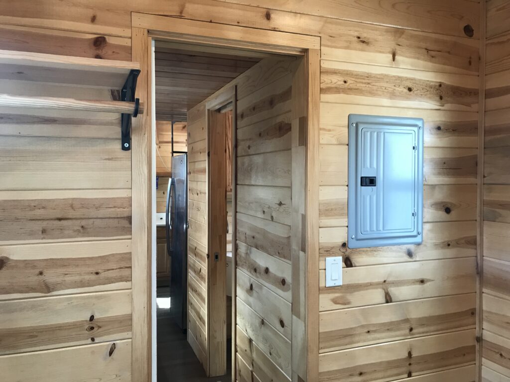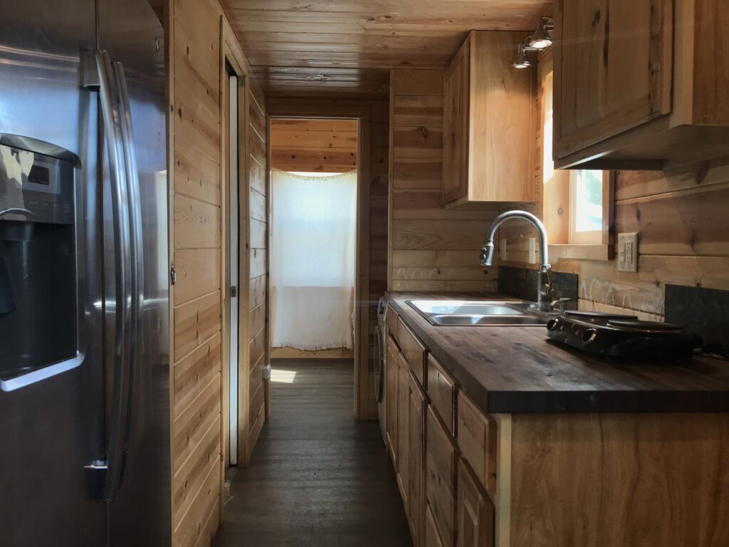 The kitchen has a large fridge, a decent amount of prep area and a hot plate. A washer/dryer hybrid fits into the adjacent utility closet which has a spot above for folding and hanging clothes. There are solid-wood shelves and cabinets throughout the house.