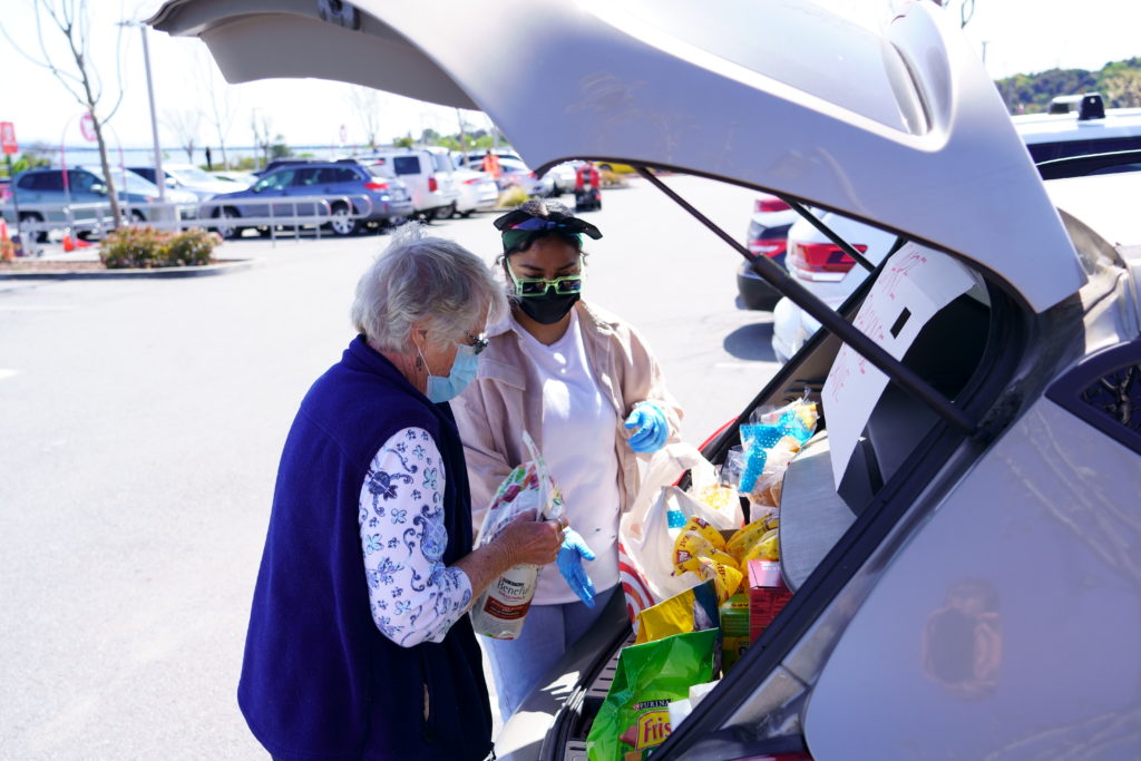 Once a month, a group of volunteers from Sonoma and Marin counties come together to gather donations and prepare care packages for people in need. They print out flyers listing the items needed for the packages — water bottles, non-perishable food, hygiene products, face masks — and hand out the flyers outside the entrances of big box stores. Charitable shoppers can then pick up the items in the store and donate them to the volunteers before they leave the parking lot. At the end of the day, the volunteers assemble the care packages, which they give to community members during distribution days.