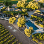 Various patios offer spots to lounge, eat and play among the vines. There’s a pool, spa and a delightfully large chess set. A stone woodburning pizza oven is the star of a full outdoor kitchen.