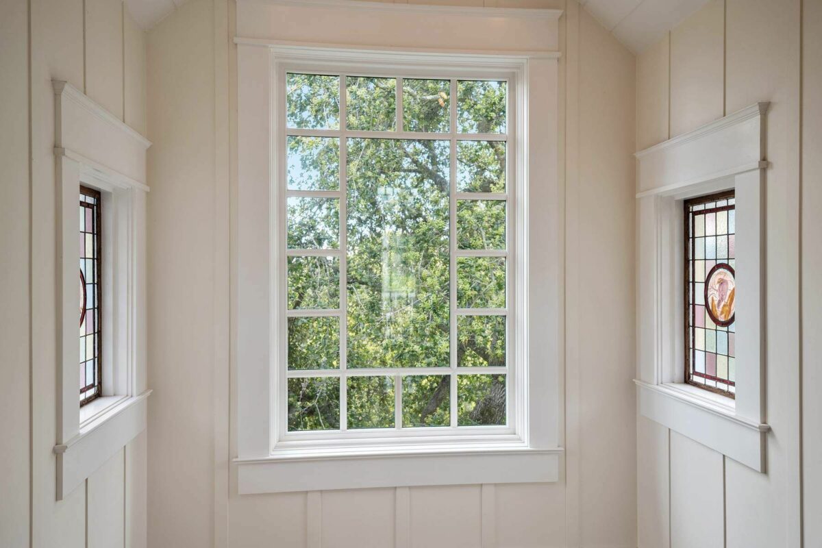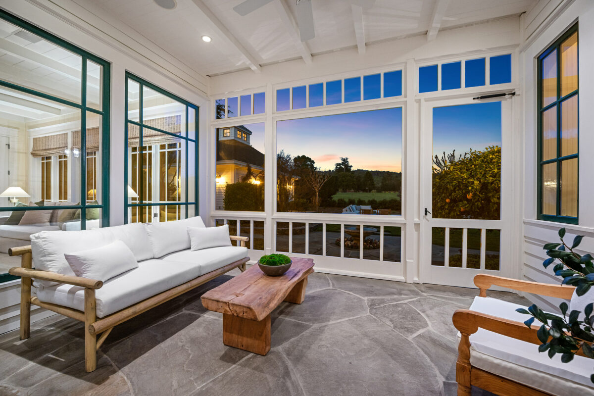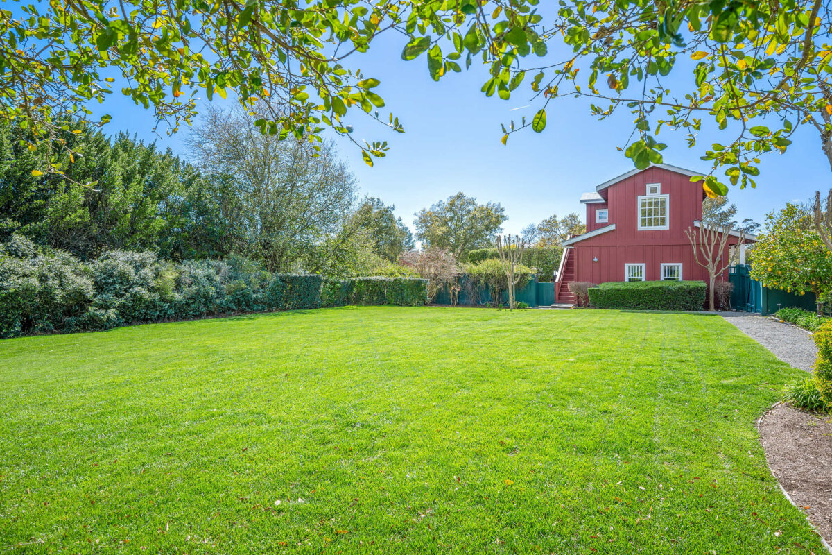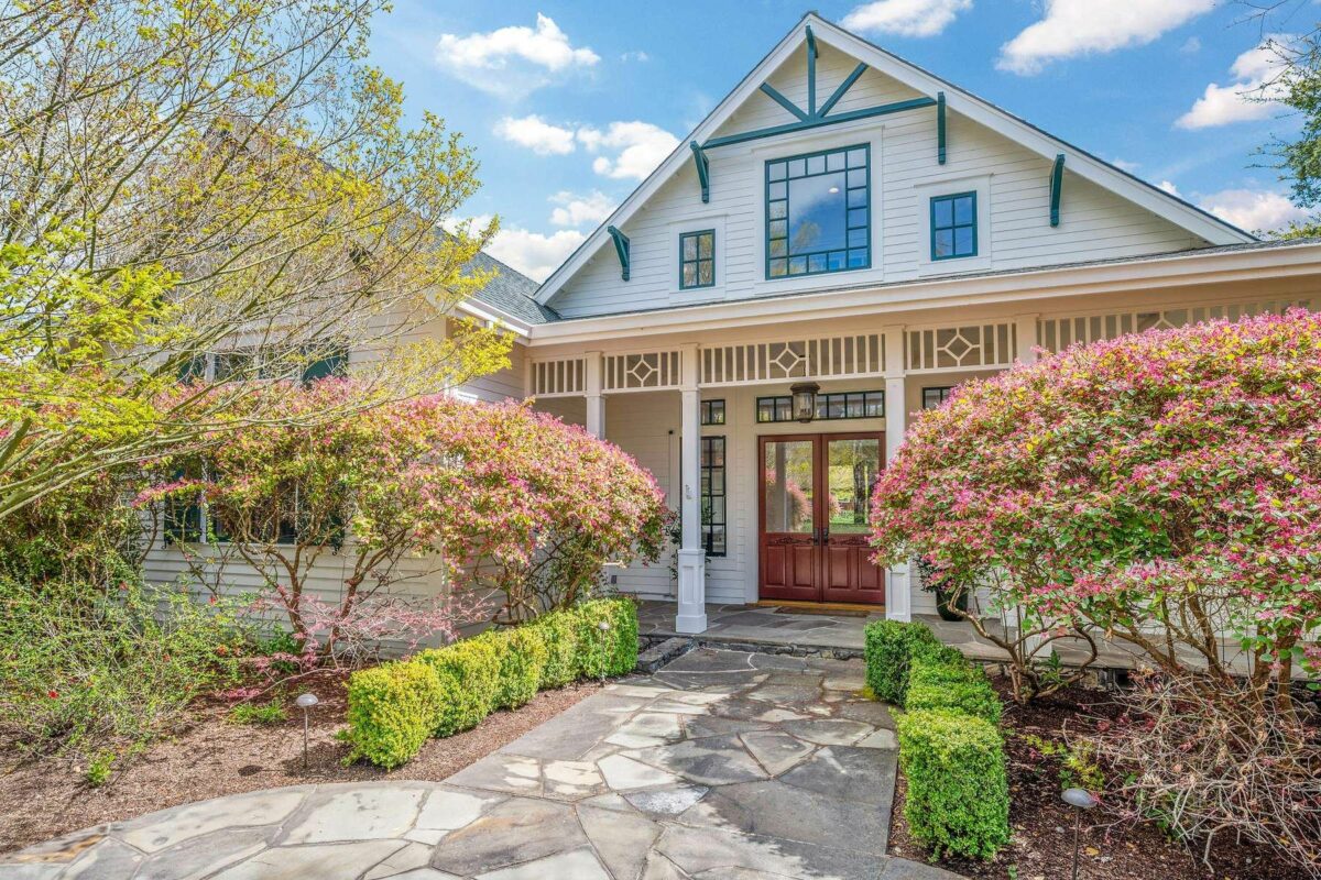 There’s a viewing porch from the second story and a screened-in porch on the bottom floor. The grounds are manicured with rounded shrubs and hedges framing large swaths of grass, paved seating areas and walking paths. A detached office has a sweetly nostalgic red-barn look.