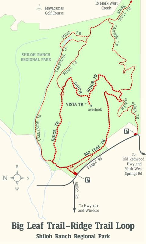 From Highway 101 in Windsor, exit on Shiloh Road. Drive 1.4 miles east to Faught Road at the base of the hills. Turn right (south) and continue 0.1 mile to the posted park entrance on the left. A $7 fee for parking in the lot is required.