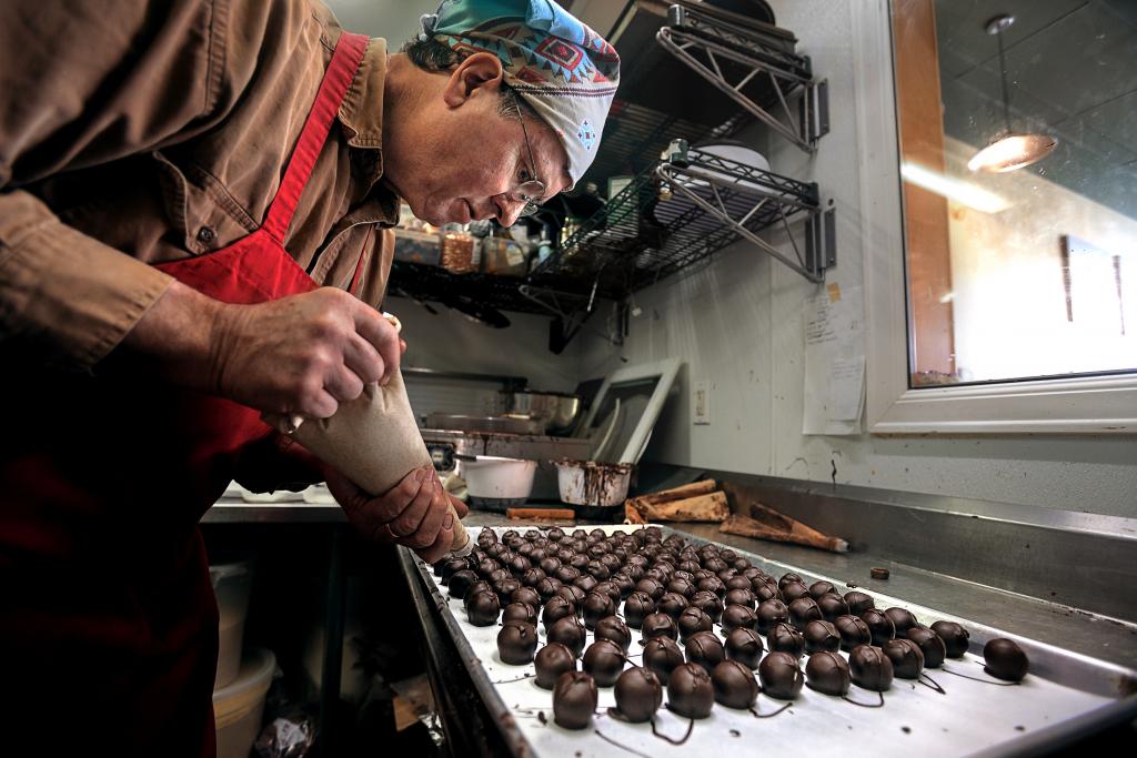 David Gambill and Susan McCarn, founders of Sebastopol’s Sonoma Chocolatiers, focus strictly on dark chocolates, crafting 90 flavors in the small store on McKinley Street where signage reads, “Taste the Darkside.” Since 2008, chief confectioner Gambill has pushed the envelope with flavors such as rosemary-goat cheese truffle, mulled cider-spiced chocolate caramel, salted grapefruit, balsamic vinegar and olive oil, and chocolates infused with black, green and herbal teas from his tea house.
