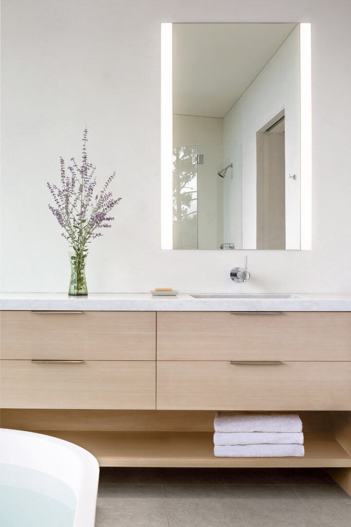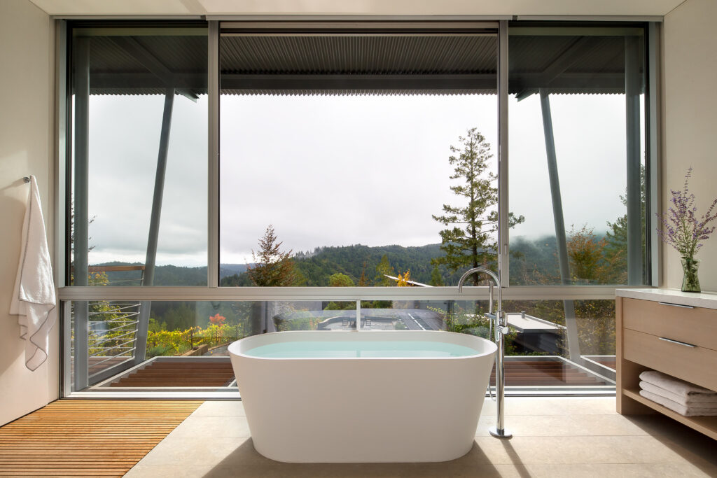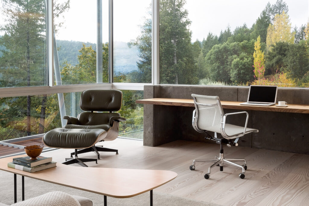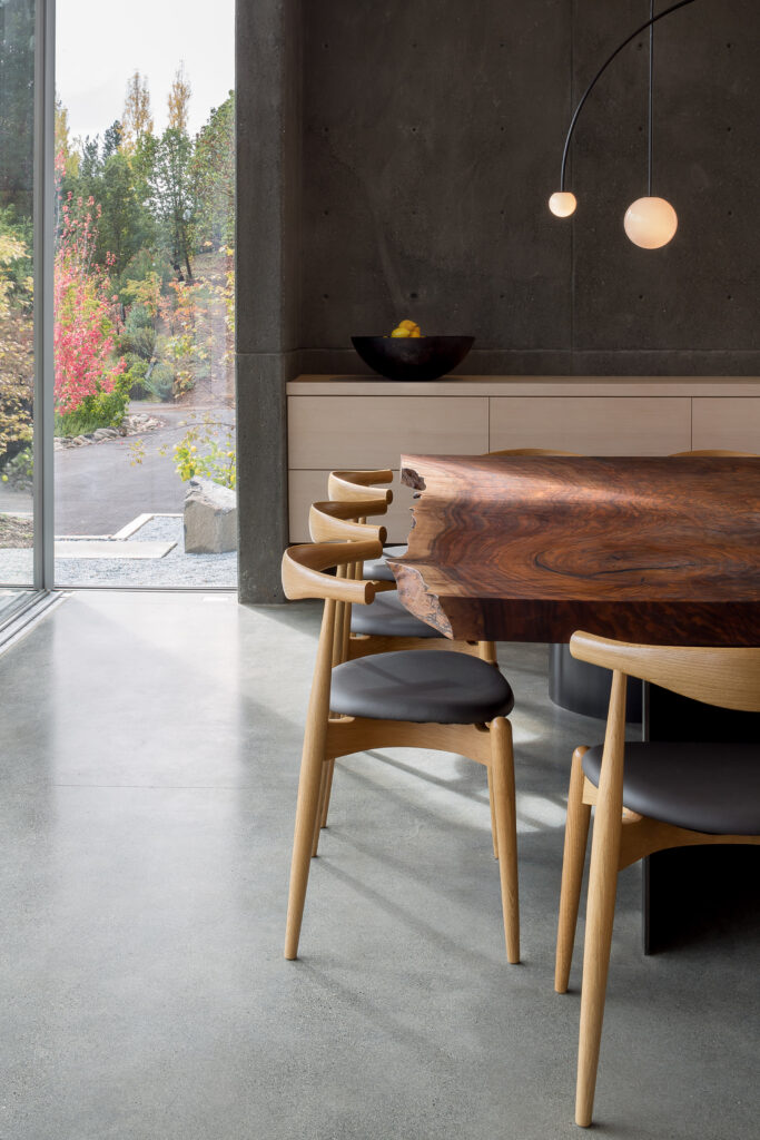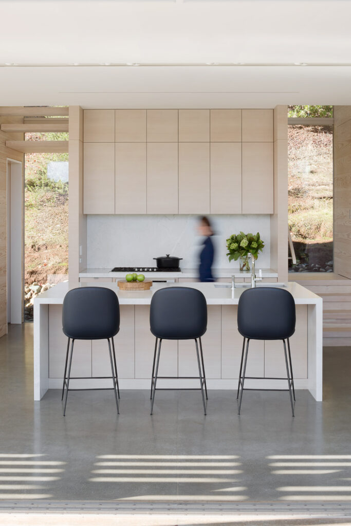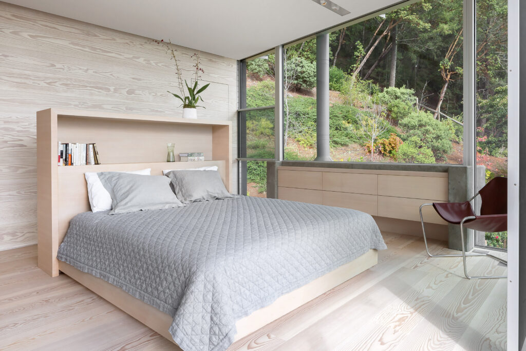 The Sonoma property was conceived as a “garden pavilion” — “a simple and modern shell that directly immerses its inhabitants” in the surroundings, according to Feldman. The homeowners are avid gardeners, so the design was intended to showcase their garden, allowing it to be seen from the indoors through a wall of glass in the front and on the sides of the house. This wall of windows also makes the 2,000-square-foot home feel more expansive. Like the Healdsburg home, this property is modern and sleek but the look is softened by dark slate grays in the concrete and Douglas fir accents.