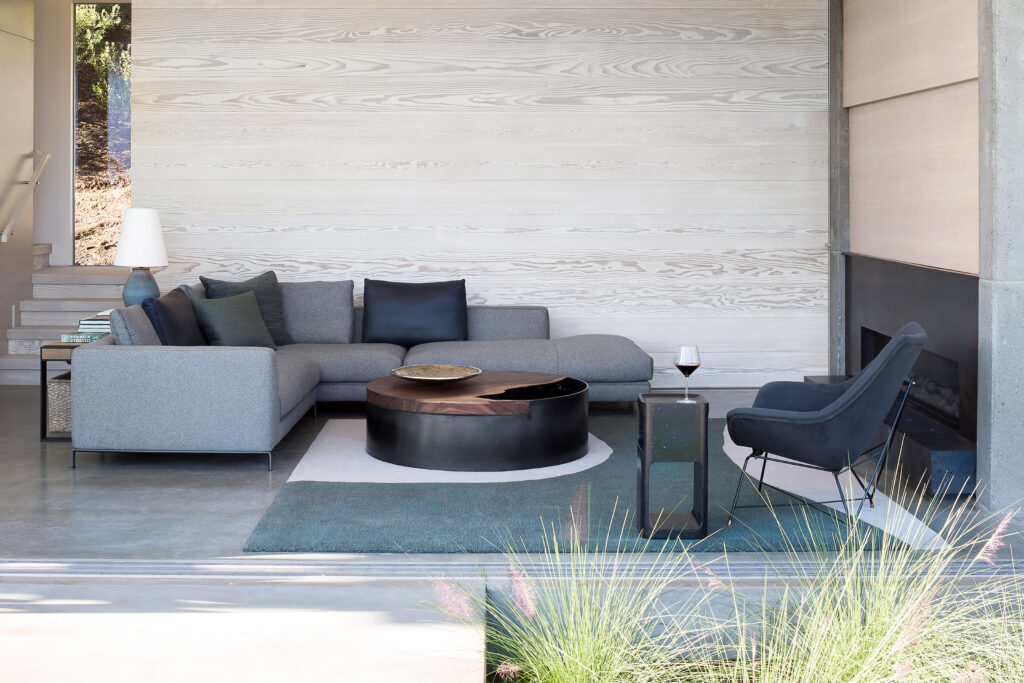 The Healdsburg home is sleek and modern with black steel elements but, in Feldman’s words, the look is “softened” by bleached walnut ceilings and plaster walls. It makes great use of the indoor-outdoor design trend that is continuing to have a big moment in California. Four massive glass doors on each side of the home roll up warehouse-style, or like garage doors, and transform the home into an open-air pavilion. Concrete floors indoors extend to the outdoors on the terrace, and around the pool and fire pit.