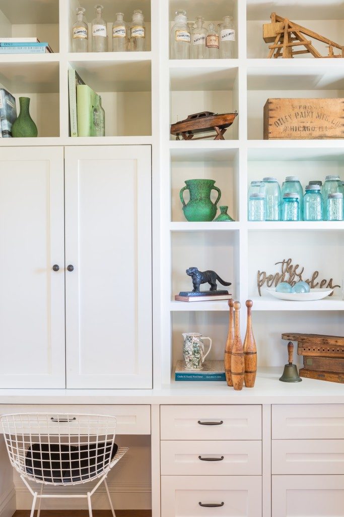 They designed the kitchen with entertaining in mind and included two sinks, one for prep and the other a cleanup area. The island has a copper top that Rich made by wrapping sheet copper around a thick base built of plywood and then mounting it on cabinets. A seating area in the kitchen, with two linen-slipcovered armchairs and a round ottoman nested in front of a large window with an orange tree in view, is their go-to spot for coffee and conversation.