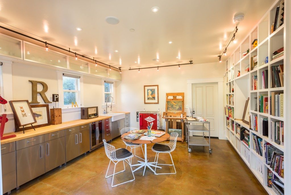 What they can’t do themselves falls to general contractor (and good friend) Jaime Rodriguez of J J Rodriguez Construction. He remodeled the kitchen and, five years ago, built a second building on the property that is home to Pembroke Studios, Inc., the design and marketing company the couple founded in 2000 when the business that had brought them to California folded. One of their first clients was their former employer — Hallmark — for whom they designed Harry Potter merchandise like pens, calendars, notebooks, bookmarks, cards and stationery. Eventually they developed a local clientele, and they are now experts in designing wine labels.