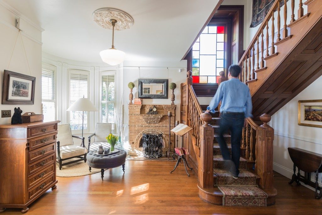 Rich meticulously restored a wooden staircase that rises from the entry hall to the second floor with a window seat at its landing. He was rewarded for his efforts not only by its beauty, but also by the discovery of a treasure found under a floorboard.
