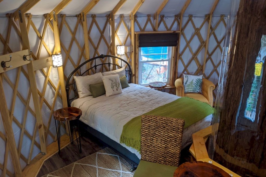 Boon Hotel & Spa glampers enjoy queen platform beds with organic linens, lanterns and boon breakfasts. There’s also electrical outlets to charge all those gadgets we travel with these days. (Courtesy of Boon Hotel & Spa)