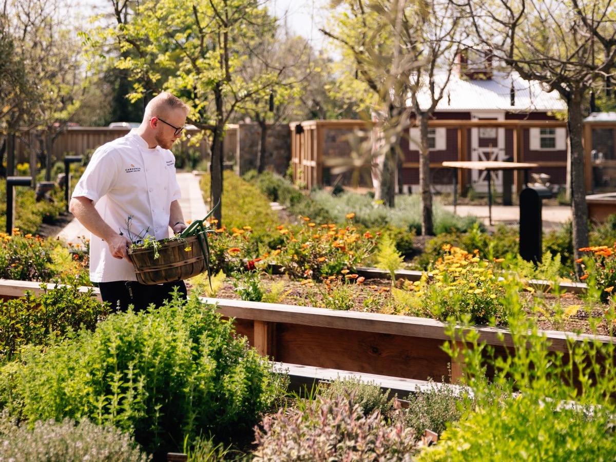 On sunny days, guests can sip wine al fresco overlooking Farm restaurant’s culinary gardens at Carneros Resort and Spa. Farm chef de cuisine John Carney has a knack for wowing diners with dishes inspired by the seasonal produce in the kitchen’s backyard. (Carneros Resort and Spa)
